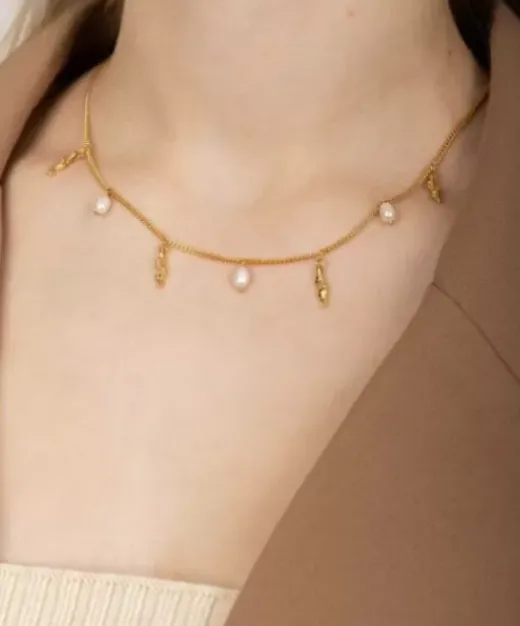 Denne Smukke Og Feminine Halskæde Er Designet Med Inspiration Af Den Store Perletrend. Den Er Virkelig Let At Have På, Og Kan Sagtens Styles Med En Anden Halskæde, For Et Tungere Look. Elsker Du Designet Med Bølger Og Perler, Kan Den Matches Med Vores Hali Pearl Earrings Eller Vores Marie Earrings.Størrelse: 36 Cm + 5 Cm Forlænger.Materiale: Guldbelagt Kobber.Vær Opmærksom På At Perlerne Er Unikke, Og Kan Afvige Fra Produktbilledet.